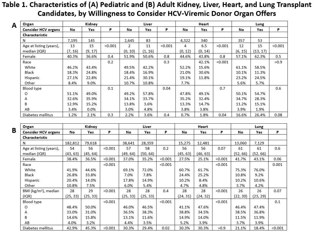 Methods: We identified all waitlist candidates 2015-2021 listed for kidney, liver, heart, or lung transplantation in the United States using the Scientific Registry of Transplant Recipients. Waitlist candidate HCV serostatus was not available, but the proportion of waitlist additions for HCV-related disease in the United States is declining. We compared patient and center characteristics using Chi-square and McNemar tests, by HCV offer interest, for pediatric (<18 years old) and adult transplant candidates.