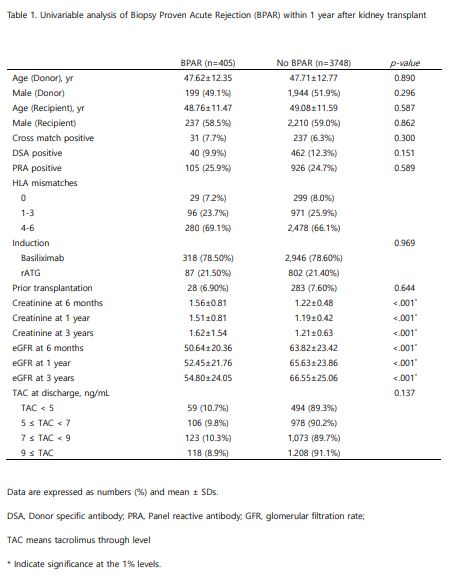 Result: There was no statistical difference in characteristics of donors and recipients between the BPAR group and no BPAR, including the immunologic factors, such as HLA mismatching, pre‐existing donor‐specific antibodies. In subgroup analysis between lower TAC trough level (<5ng/mL) and higher TAC (≥9ng/mL) at discharge, there was somewhat increased BPAR in lower TAC without statistical significance (10.7% vs. 8.9%, P=0.137). Renal functions after KT were better in the no BPAR group with statistical significance (p<0.001).