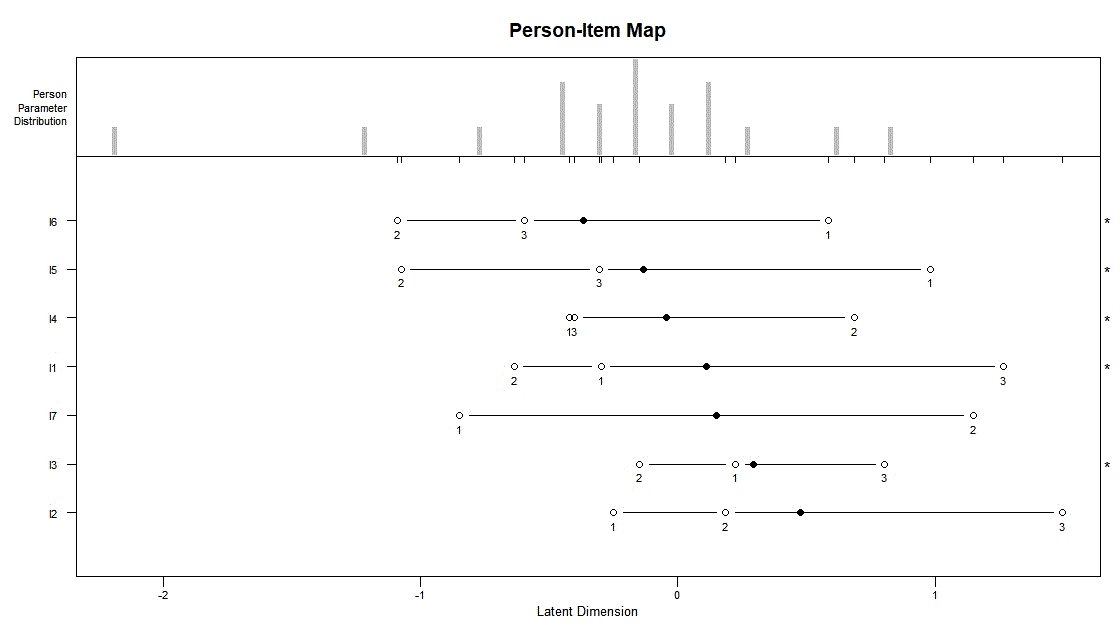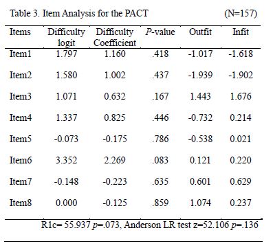 Results: All the dichotomously categorized items fit the Rasch model. R1c statistic and Anderson test results showed that the model fit was stable (p>.05), and both outfit and infit statistics were between -1.94 and 1.07. The estimate of the item discrimination parameter was 1.416. Item difficulty was between -0.22 and 2.27, reflecting acceptable and good levels.