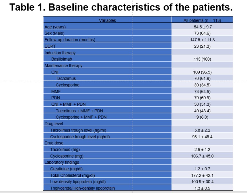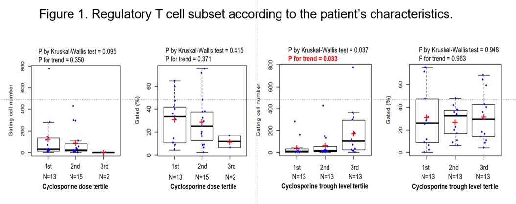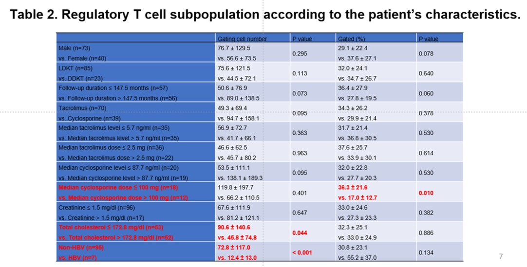 Results: Among the 113 patients, 73 patients (64.6%) were males and mean follow-up period was 147.5 ± 111.3 months. All patients received calcineurininhibitors as maintenance immunosuppressants. Patients with follow-up period more than 144.3 months tended to have more gating Tregs numbers than that inshorter follow-up period (92.3 ± 142.4 vs. 50.1 ± 76.4, p= 0.061, respectively). There were no significant differences in Tregs subpopulations between patientswith serum creatinine more than 1.5 md/dL and patients with serum creatinine less than 1.5 mg/dL. In terms of the number of Tregs, when the trough level oftacrolimus was at an appropriate level, the number of Tregs tended to be higher than that of Tregs when the trough level of tacrolimus was low or high, and theorgan function of the transplant was also stable.
