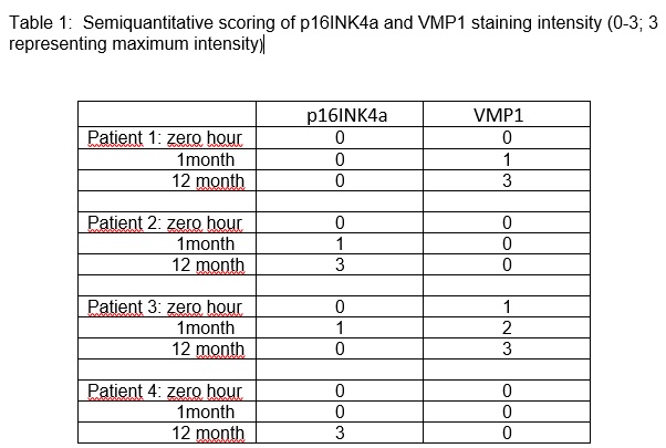 Materials and Methods: Protocol transplant(Tx) kidney biopsies at zero hour, 1 and 12 post Tx months in patients who consent were included. Immunohistochemistry staining for p16 INK4a was performed on paraffin biopsy sections with peroxidase anti-peroxidase Ventana BENCHMARK- XT. Immunofluorescence with antibodies to Polyclonal rabbit antiserum to VMP1 were used. We evaluated the extent of nuclear p16INK4a staining and VMP1 positive expression as a punctate cytoplasmic structure in the renal cortex. Semiquantitative scoring of p16INK4a and VMP1 staining intensity (1-3; 3 representing maximum intensity) was analyzed.