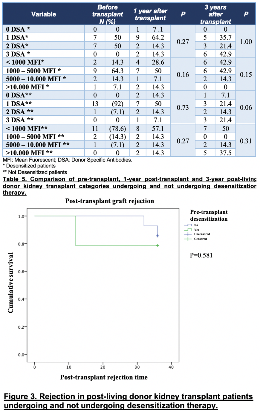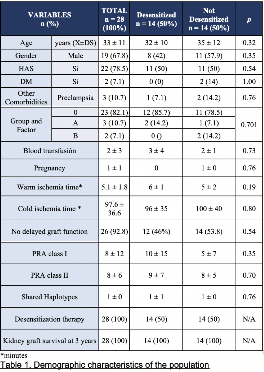Results: 28 patients in total, 50% patients did not receive desensitization therapy and 50% received desensitization therapy. 67.8% were men. The average age was 33 years. 17.8% of patients developed antibody-mediated rejection, of which desensitized patients were 21.4% and non-desensitized patients were 14.2%. When comparing groups, no statistical significance was found (P=0.581).