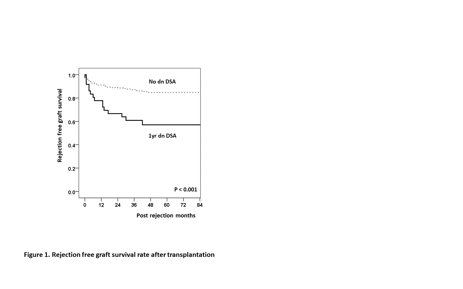 Results: The baseline characteristics showed no difference between the two groups except the degrees of PRA class I and II were significantly higher in the ABOc group (P = 0.010 and P = 0.036). The incidence of dn DSA during one year after KT was significantly lower in ABOi group than in the ABOc (n=34, 15.3% vs. n=2, 3.8% P = 0.028). Multivariate analysis indicated that ABO incompatibility was the only significant factor associated with the development of one year de novo DSA (OR[CI], 0.22 [0.05 – 0.95]; P = 0.043). Overall rejection-free survival was inferior in patients who developed the dn DSA within one year than in patients without dn DSA for one year following KT (P < 0.001).