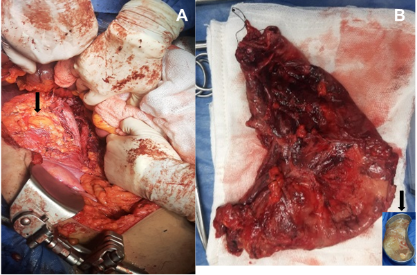 Resection of the tumor is performed, finding: Retroperitoneal tumor of 25 x 25 x 20 cm on the vena cava and aorta, which displaces the pancreas towards the head, without its involvement, with a mucous content of 2 Lts.