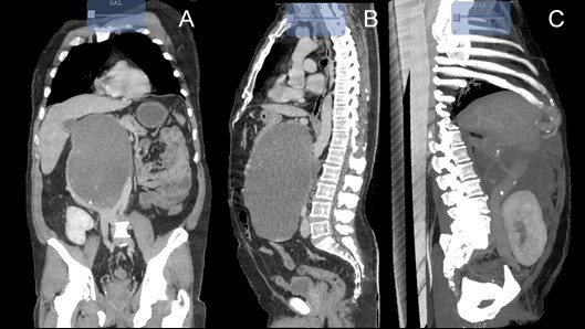 Methodology: We describe the case of a 59-year-old male, group B+, who received a transplant from a Related Living Donor in 2011, sharing a haplotype, undergoing induction with Daclizumab 80mg DU, and with immunosuppression based on Cyclosporine 1.8mg every 12h, Mycophenolate 1g every 12 hours and Prednisone 5 mg every 24 hours; He began suffering in December 2020 with abdominal pain in the epigastrium, hyporexia and weight loss, Laboratories: Creatinine: 1.15, Urea 32, Glucose 102mg / dL, Hb 17.6mg / dL, Hto 52.40, Leukocytes 7.9X1000, Platelets 233x1000; tumor markers: Alpha fetus 2.16 ng/ml, CA 19-9 524.5 IU/ml, A. Carcinoembryonic 67.53 ng/ml. On examination, the kidney graft showed no alterations, and a palpable abdominal tumor of 30 x 25 cm, painful on palpation. Tomography reported a retroperitoneal tumor of 25.8 x 16.9 x 19 cm with displacement of adjacent structures and compression of the inferior vena cava.