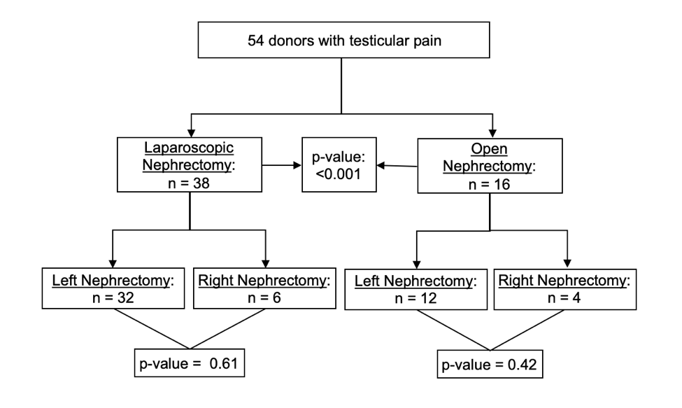 Conclusions: The incidence of testicular pain was 2.12%; similar to previous retrospective studies. Factors associated with its development include non-Hispanic White ethnicity and undergoing a laparoscopic nephrectomy. Contrary to previous reports, the laterality of the donated kidney was not associated with an increased risk of testicular pain. We believe that donors should be routinely asked about this potentially bothersome complication.