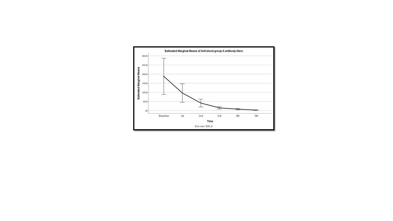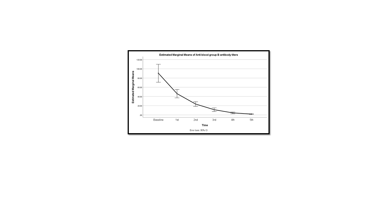 Results: This study showed that blood groups (A),(B),(O) was 12,8,5 patients respectively. The Baseline Anti (A) and Anti (B) antibodies titer before plasma exchange were {median (IQR) 128.00 (64-256) and 64 (64-128)} respectively with significant reduction after 5 sessions with {median (IQR) 1 (0-4) and 2 (1-2)} respectively p value<0.001, 0.001 respectively. Anti (A) and Anti (B) antibodies titer reduction percent after 1st session {mean±SD -47.06±12.3% and -50.00%±17.68%} respectively reaching after 5th session {mean±SD -97.9 3±0.99% and -99.04±0.72%} respectively. Anti (A) and Anti (B) antibodies titer were negatively correlated with patient’s age (r -0.793 P <0.001, r-0.731, p 0.005) respectively. Patients with age <50 (N=13) years has higher baseline Anti (A) and Anti (B) antibodies {medain (IQR) 256 (256-512), 128 (128-128)} respectively compared with patients with age >50years (N=12) {medain (IQR) 64(64-64), 64(48-64)} respectively p value 0.002, 0.001 respectively. Also on comparing Patients on immunosuppressive drugs (N= 14) and without immunosuppressive drugs (N=11) there was no significant difference in baseline Anti (B) titer {medain (IQR) 64(64-128) vs 96(64-128)} p value 0.53 while baseline Anti (A) titer was significantly higher in patients without immunosuppressive versus patients with immunosuppressive drugs {median (IQR) 256(256-512) vs 64(64-96)} p value 0.01 and the titer after 5th session {median (IQR) 4 (4-4) vs 0.5(0-1)} p-value 0.01.