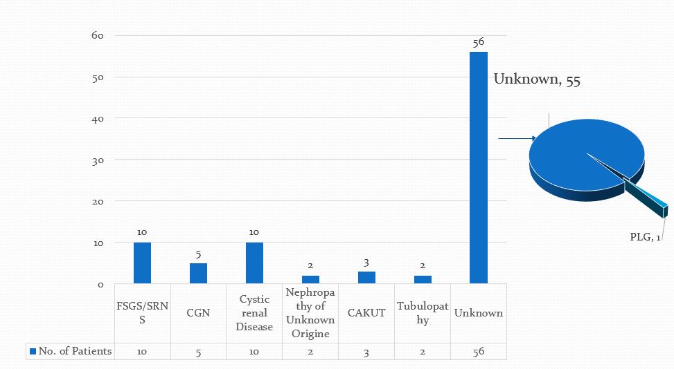 Results: Mean age was 36±12 years, 96 (78%) were Males. 88 (71.5%) were undetermined and 35 (28.4 %) had established cause of CKD. 8 patients had structural or hereditary kidney disease and 27 were non-hereditary including DKD, Glomerulopathy, Obstructive uropathy and CTID diagnosed by kidney biopsy and clinical and radiological presentations. 17/88 (19.3%) patients with undetermined CKD on renal biopsy showed Glomerulosclerosis (6), CGN (8) & TMA (2). one had advanced renal damage. 32/88 (36.36%) patients had genetic mutations related to kidney disease. 20 were structural congenital or hereditary kidney disease & 10 had a mutation for Glomerulopathies.