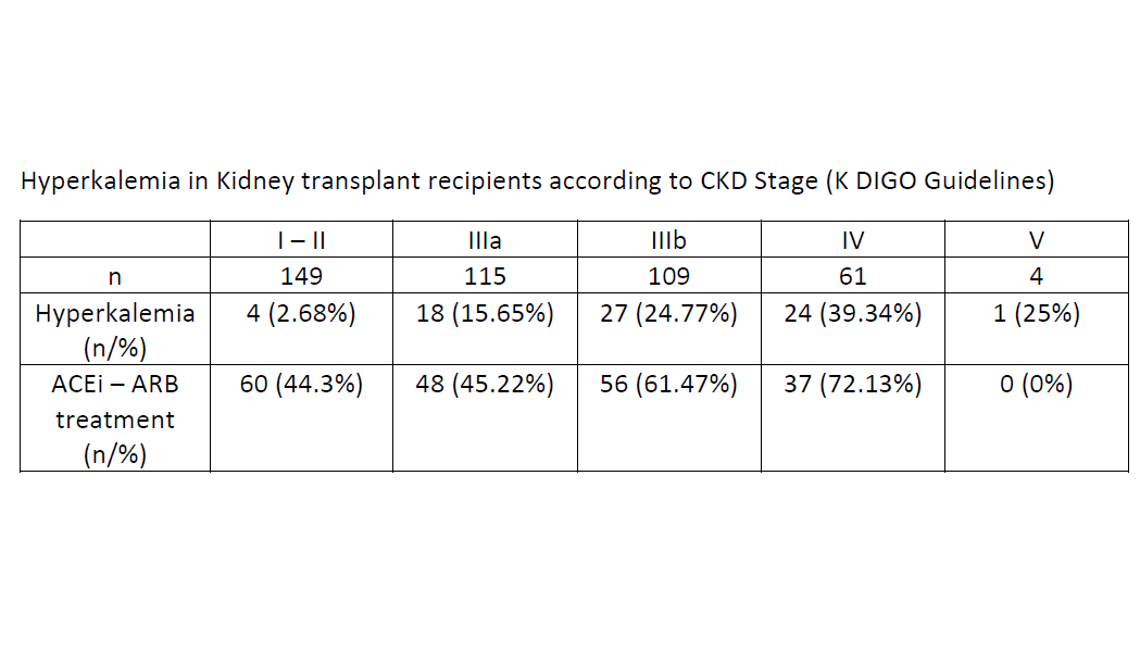 Conclusions: 16% of transplant patients presented hyperkalemia in our series, with a significant difference between those with early stages of kidney disease (2.68% in stages I and II) vs those with CKD IV (39%). Although half of the patients are nephroprotected by RAASi, 29% of them have a dose lower than the average dose.