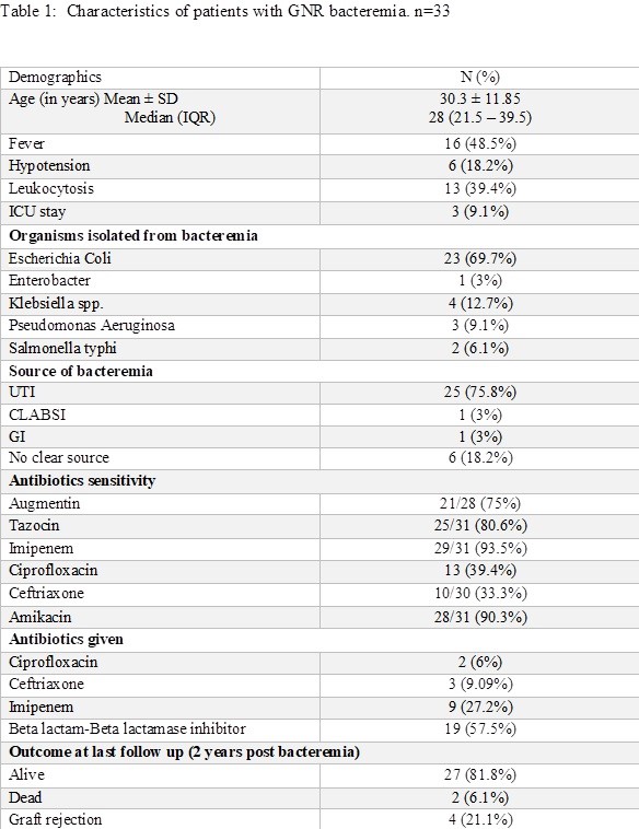 Results: Out of 1009 RTR, 33 (3.3%) episodes of GNB occurred. The mean age was 30±11.85years, 61% males. Around 48% developed bacteremia within 6 months post-transplant. The most common source was UTI (75.8%). Fever in 48% and only 39% had leukocytosis. Around 9% were admitted in the intensive care unit. E-coli was the most common organism (70%) (Table 1).