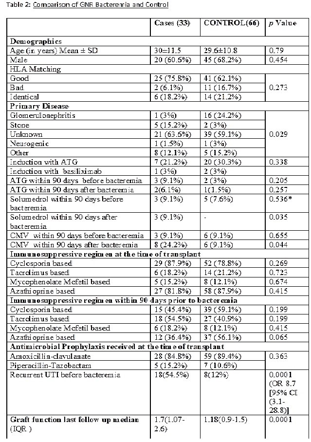 Methods: A case-control study at Sindh Institute of Urology and Transplantation (SIUT), Karachi, Pakistan. The files of all renal transplant recipients who had documented GNB from January 2015 to December 2017 were reviewed till December 2020. The controls were matched with age, sex, and date of transplant. The first episode of GNB was taken. Clinical features, received anti-thymocyte globulin (ATG) or solumederol and cytomegalovirus infection (CMV) 90 days pre or post bacteremia, recurrent urinary tract infections (UTI), source of bacteremia and microbiology, all-cause mortality at day 28 and graft function at the last follow up were noted.