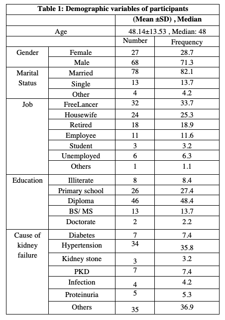 Result: From the total numbers of patients, 27 (28.7%) were female, 78(83 %) were married, 34(36.2 %) were under diploma and 32(34 %) were freelance worker. The mean and SD were showed in Table 1.