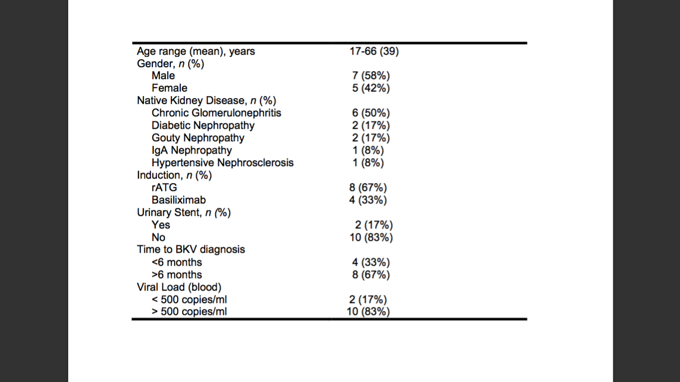 Methods: This is a retrospective study conducted at the NKTI wherein chart review was performed. Age, gender, native kidney disease, viral loads (urine and blood), graft biopsy results were reviewed. Clinical outcomes such as graft failure, early complications, and readmission were also determined.