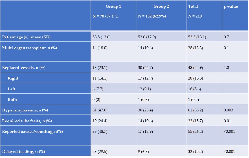 Methods: A retrospective analysis of cadaveric OLT (n=210) with recipient GDA ligated (Group 1) or not (Group 2). Impact was evaluated by occurrence of HAT and consequences by post-operative hyperamylasemia (POHA), nausea and vomiting and delayed feeding.