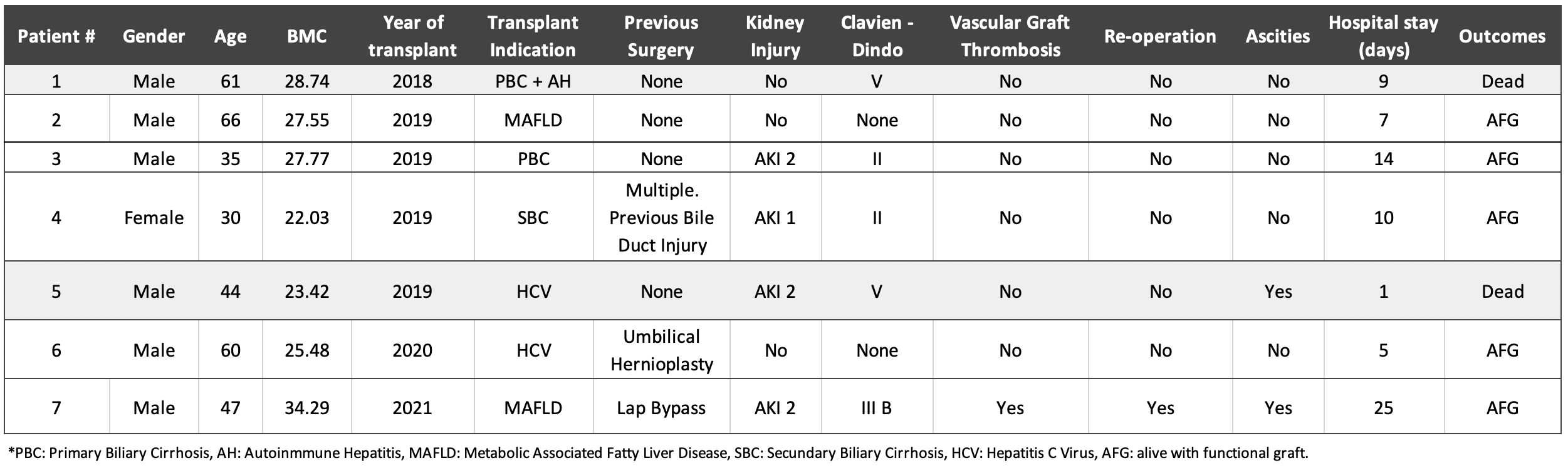 Method: We reviewed patients that underwent liver transplantation at our institution, from 2018 to 2021. Those who underwent reno-portal anastomosis were included. Descriptive analysis was performed. Variables were extracted from our prospective database and analyzed with SPSS Version 22.0.