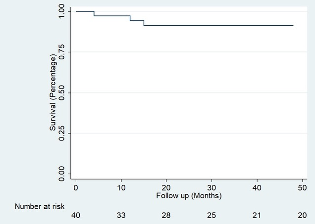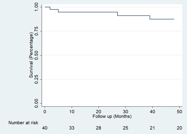 Results: Between 1996 and 2019, 877 liver transplants were performed in adult patients at our Hospital, 49 of which (5.6%) were re-LTs. In 16 cases (32.7%) were early re-LT, while 33 (67.3%) were late. Mean age was 47 (IQR 36-60) and 26 (53%) were male. The main cause of LT was Hepatitis C Virus (HCV) in 17 (35%) patients, while Autoimmune Hepatitis (AIH) was second in frequency, with 9 patients (18.4%). The main indications of early re-LT were arterial thrombosis 9 (56.3%) and primary graft dysfunction 3 (18.8%). For late re-LT, the most frequent causes were primary disease recurrence 15 (45.5%) and biliary stricture 9 (27.3%). Median time to re-LT was 35 months (CI 5-98). 38 patients presented a total of 58 postoperative complications, 21 (36%) of these were immediate, 14 (24%) mediate and 23 (39%) presented late complications. The most frequent complication was bleeding 7 (33%) in the immediate period, rejection 5 (35.7%) in the mediate stage, and primary disease recurrence 10 (43.5%) in the late stage. With a mean follow-up of 3.08 years, there were a total of 13 (26%) deaths, 6 of which were within the first 90 days of surgery and 4 during the first 24 hours. The patient's overall survival (OS) for the first year was 85% (Confidence Intervals (CI) 71-92) and 70% at five years (CI 53-82) Figure 1. Three (6.12%) patients presented loss of graft and were included again in the transplant list; of these, one agreed to a new transplant while the remaining two died. This gave us graft survival results similar to those obtained for the re-LT patient; 85% at one year (CI 71-92) and 70% at 5 years (CI 53-82) Figure 2.