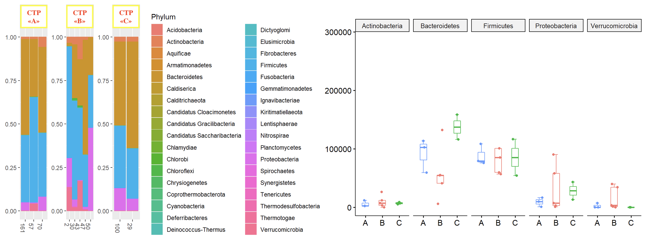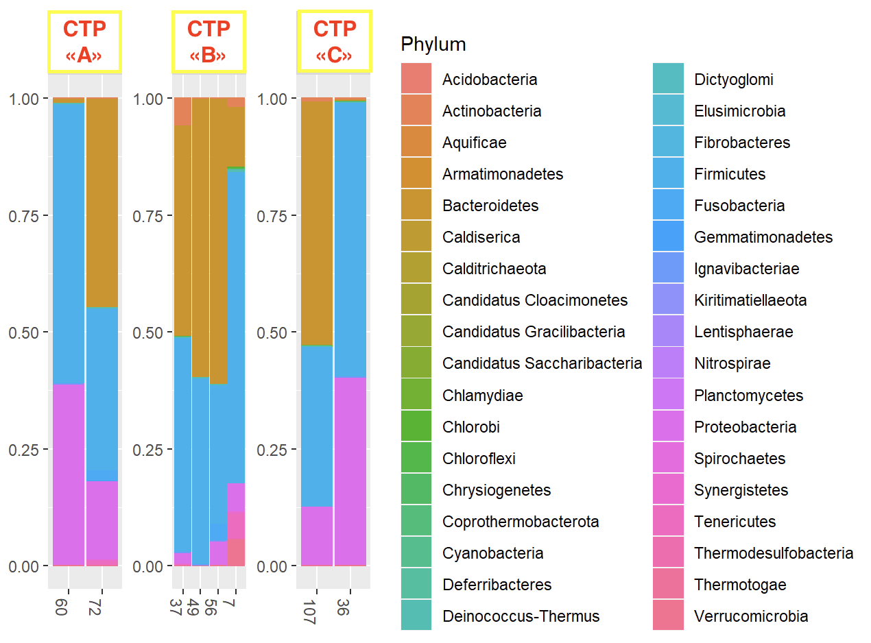Results: The results of our study showed the absence of any statistically significant difference in the gut microbiota palette of patients with liver cirrhosis of different Child-Turcotte-Pugh functional classes as well as the MELD score (p>0.05) (Fig. 1). Moreover, we did not observe any significant difference in the gut microbiome palette in patients after liver transplantation who were initially referred to different Child-Turcotte-Pugh functional classes (p>0.05). However, in the post-transplant period, Protobacteria were replaced by Bacterioides in patients of the liver cirrhosis group. Besides, in the long-term period after liver transplantation, we noted some difference in the microbiome palette in patients of different functional classes of severity (Fig. 2). At the same time, we noted a pronounced difference in the taxometric picture of the gut microbiom in the post-transplant period in a patient with developed acute cellular rejection.
