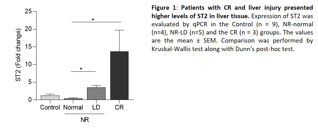 Results: Hepatic levels of IL33 were not statistically different among groups. Nevertheless, the expression of ST2 was significantly higher in liver samples obtained from patients in CR and NR-LD groups (p< 0.05) (Figure 1). Then, we investigated whether ST2 levels were associated with hepatocellular and cholestatic damage, finding that ST2 correlated positively with TB, AST, ALT and ALP levels (p<0.05). Considering that Hepatic Stellate Cells (HSC) are the main source of ECM and collagen and its activation is dependent on IL-33/ST2 signaling, the activation marker α-SMA and the principal profibrogenic cytokine, TGF-β, were evaluated by qPCR in liver tissue. Levels of α-SMA. and TGF-β were increased in the CR group compared with the controls and the NR group, but these differences were not statistically significant. Moreover, the expression of α-SMA positively correlated with METAVIR score in LT patients (p<0.05).