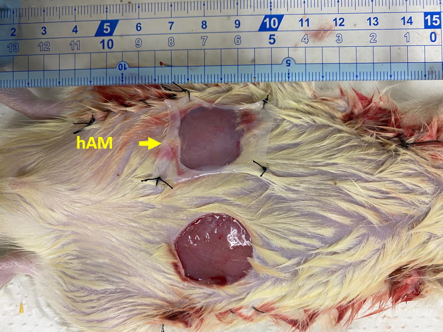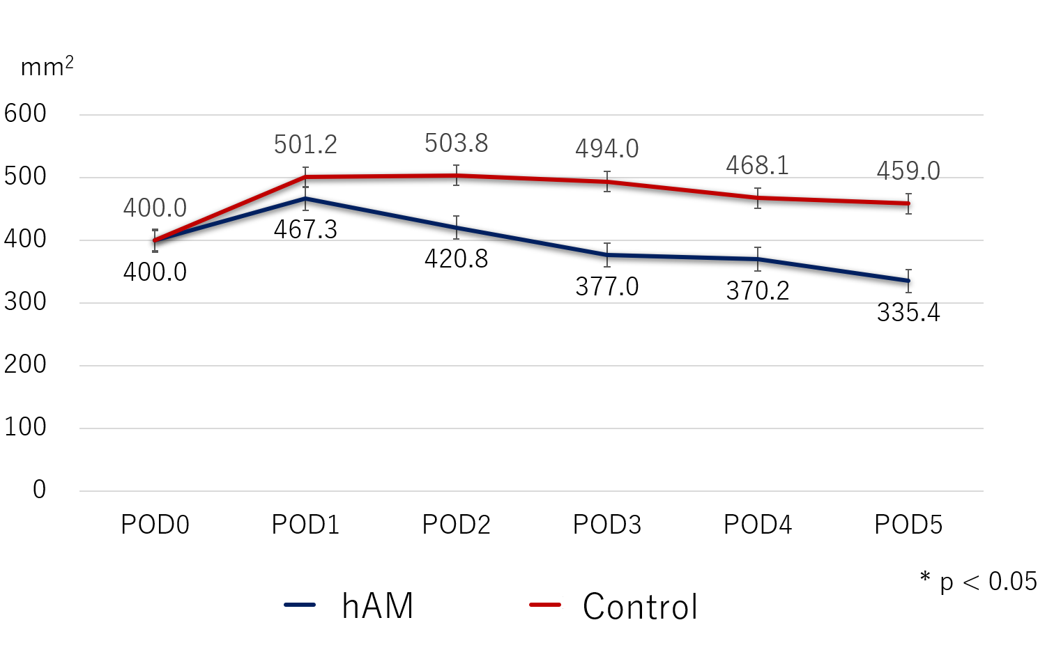 Results: The wound area after 5 days was significantly smaller in hAM group than in control group (335 vs. 459 mm2, p = 0.0051). The mean value of MVD was significantly higher in hAM group than in control group (19.0 vs. 15.1, p = 0.0026). Histological evaluation showed no obvious rejection of the hAM in this study.