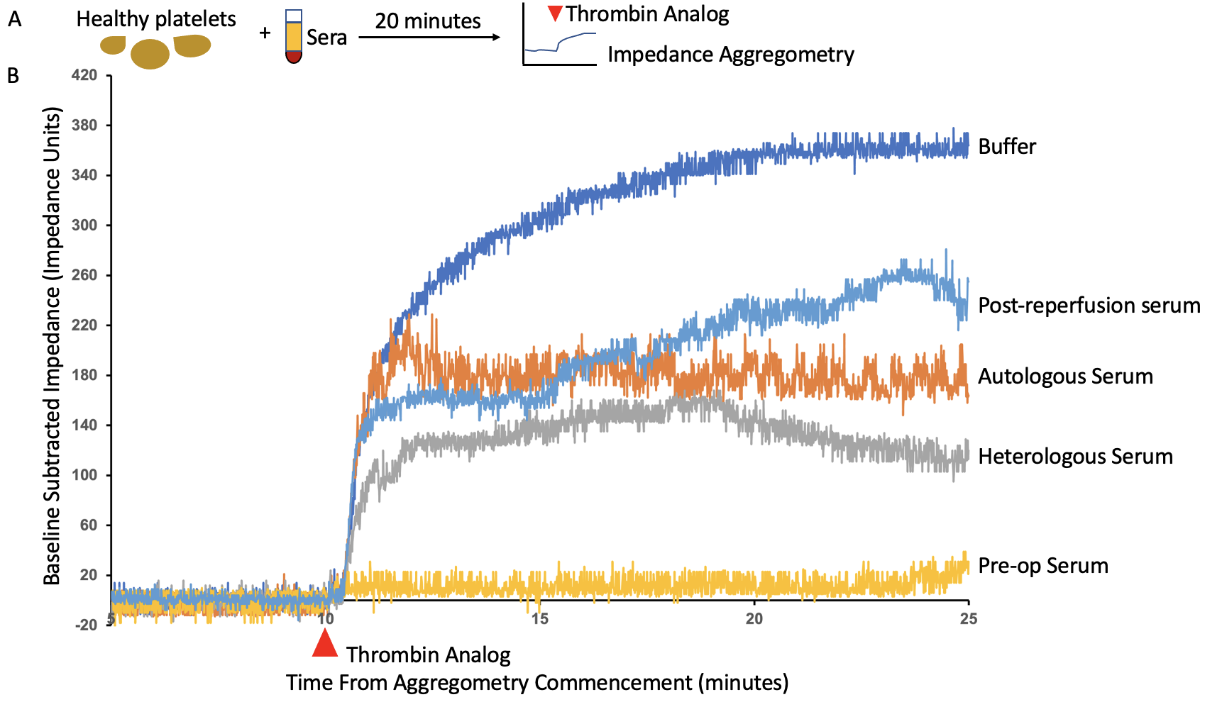 Methods: Serum was collected from liver transplant recipients prior to incision, and two hours following portal reperfusion as part of the Mild Hypothermia and Acute Kidney Injury in Liver Transplantation trial (NCT03534141). Platelets (from male and female healthy platelet donors) were isolated by centrifugation, pelleted, and mixed with each of the following sera (6 of each group): buffer, autologous, gender matched healthy (heterologous), gender matched pre-transplant, and gender matched post-portal reperfusion (12% v/v) for 20min (Fig1A). Baseline aggregation was measured for 10min via multiple impedance aggregometer, then stimulated with a thrombin analog and measured for 15min. Aggregometry responses were quantified by the area under the impedance aggregation curve (AUC), normalized to autologous treated platelets. Statistical analysis was performed using one way ANOVA, with Tukey’s Honest Significant Difference testing post-hoc for pairwise comparisons.