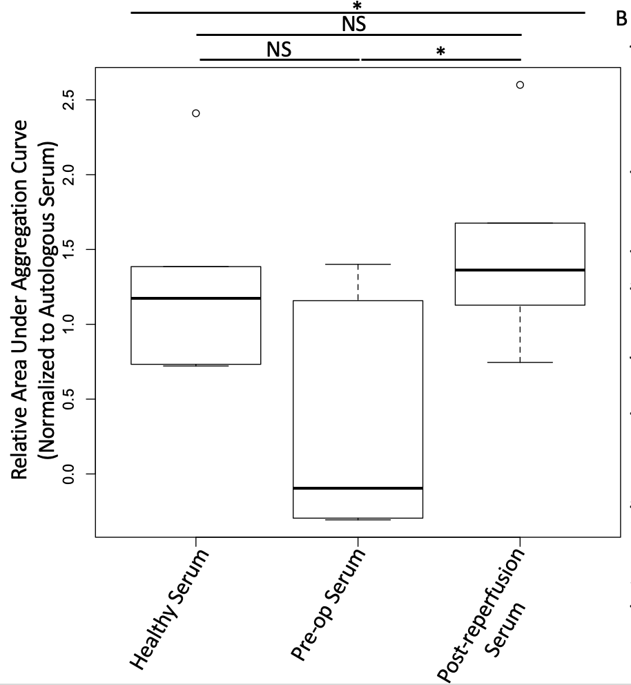 Results: Healthy platelet aggregation was markedly impaired upon treatment with pre-transplant serum, but was restored when treated with serum from the same cohort of patients two hours post-portal reperfusion (to levels similar to treatment with healthy sera, Fig1B). Healthy platelet aggregation upon treatment with post-portal reperfusion serum was significantly higher than with pre-transplant serum treatment (median relative AUC 1.4x vs -0.1x, p<0.05; Fig2).