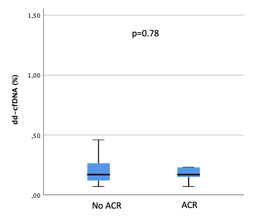 Method: Among the patients who received a protocol or for-cause endomyocardial biopsy (EMBx) in the period 2017-2021 at our center, we selected those with available biobanked plasma as part of the CLIN-HEART registry. ddcfDNA was measured using MiSeq Illumina platform, according to the AlloSeq cfDNA protocol (CAREDx, San Francisco, CA, USA). Pulmonary arterial wedge pressure (PAWP), right atrial pressure (RAP) and cardiac index (CI) were assessed at the time of the EMBx. Significant rejection was defined as ACR grade ≥2 and AMR grade ≥1, according to International Society for Heart and Lung Transplantation classification.
