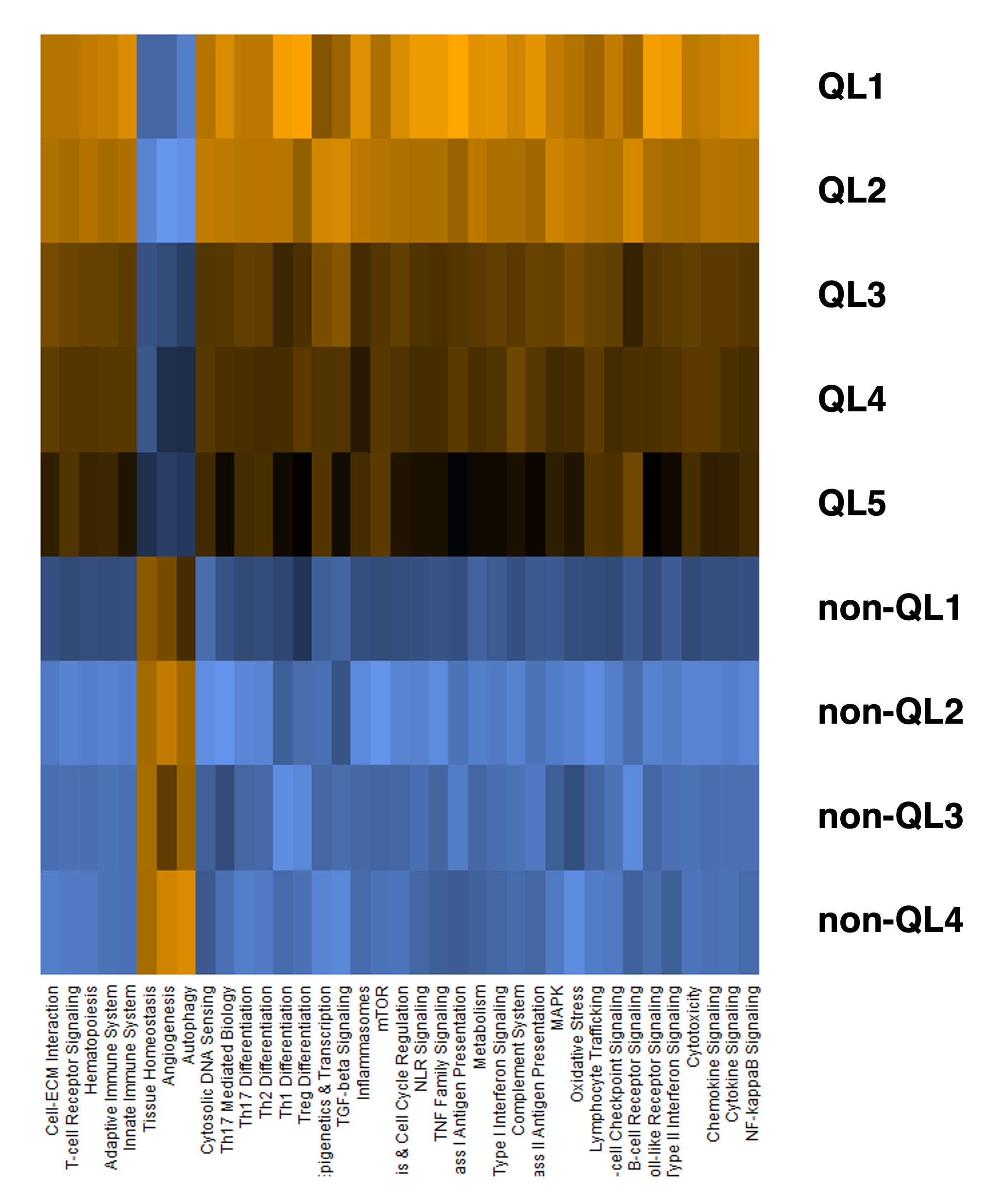 Materials and Methods: Forty two (42) endomyocardial allograft biopsies were included in this study. Biopsies were scored by the ISHLT criteria for rejection, and immunolabled for the T-cell markers CD4 and CD8, and the immunoregulatory markers Foxp3 and TGFbeta 1 for quantification. A subset of 9 biopsies, 5 with QL and 4 without QL were addtionally analized for mRNA expression. Multiplexed mRNA measurement was performed using the nCounter system (NanoString Technologies, Seattle, WA), and data were analyzed with nSolver software (NanoString Technologies, Seattle, WA).