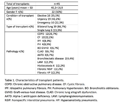 Methods: Descriptive and retrospective study of transplanted and re-transplanted patients.45 transplants were performed, including 3 re-transplants, 6 patients who died due to another cause in the first month after LT were excluded.