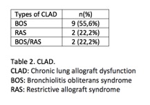 Results: the characteristics of the patients and their transplants are exposed in Table 1. More than half of LT occurred in the last 5 years. The median conditional survival of the program is 7.5 years. There were 29 cellular RA (CAR) events in a total of 19 patients (48.7% of the total); 12 patients presented 1 event, 4 patients 2 events and 3 patients 3 events. These events occurred: 10 in the first month post LT (34,5%), 5 between 1 and 3 months (17,1%), 7 between 3 months and 1 year (24,2%), 7 after the first year (24,2%). Rejection level was A1 in 55,1%, A2 in 41,4% and A4 in 3,5%. The diagnosis was through surveillance endoscopies in 22 events (75,8%), the remaining diagnoses were made in the context of suspected rejection. 23 of the events (79,3%) were asymptomatic, while in the other ones presented as cough, expectoration, and/or dyspnea, being the infectious cause the main differential diagnosis. 17 patients (58,6%) received treatment, 10 cases due to grade of CAR ≥ A2; the remaining patients despite their lower level, presented symptoms, spirometric and /or imageology disturbance, justifing this behavior. Intravenous methylprednisolone were done in 5 patients and oral corticoids in the remaining 12 patients. It is interesting to mention that one patient (2,2%) suffered hyperacute rejection dying 48hs after LT and other one (2,2%) humoral AR. This patient received plasmapheresis and immunoglobin, with satisfactory evolution. 13 patients (44,8%) developed CLAD (Table 2). 9 cases (69,2%) had at least one previous CAR event. 12 of the 13 cases occurred in the first 5 years. All of them had symptoms and functional impairment as presentation form. All received azithromycin and 10 of 13 montelukast. 3 patients were transplanted due to CLAD, 2 developed BOS again.
