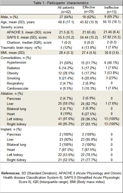 Results: 42 real donor patients were included, of which 29 (69%) were effective. Table 1 shows the clinical-demographic characteristics.