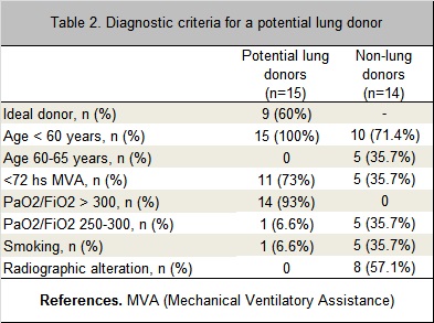 Applying the eligibility criteria, 15 potential lung donors were identified, of which 9 met ideal criteria and 6 as marginal donors. Table 2 compares patients who meet the criteria as potential lung donors with those who do not. Of the patients identified as potential donors and presented as candidates for lung ablation, only 2 (13%) were accepted and implanted.