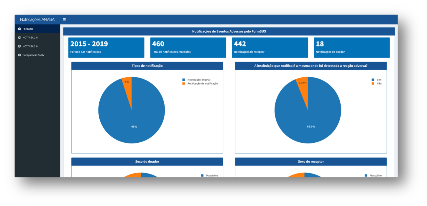 The National Biovigilance System Platform dashboard is based on a data visualization framework called Shiny. It has graphics of high visual appeal and great informational power.