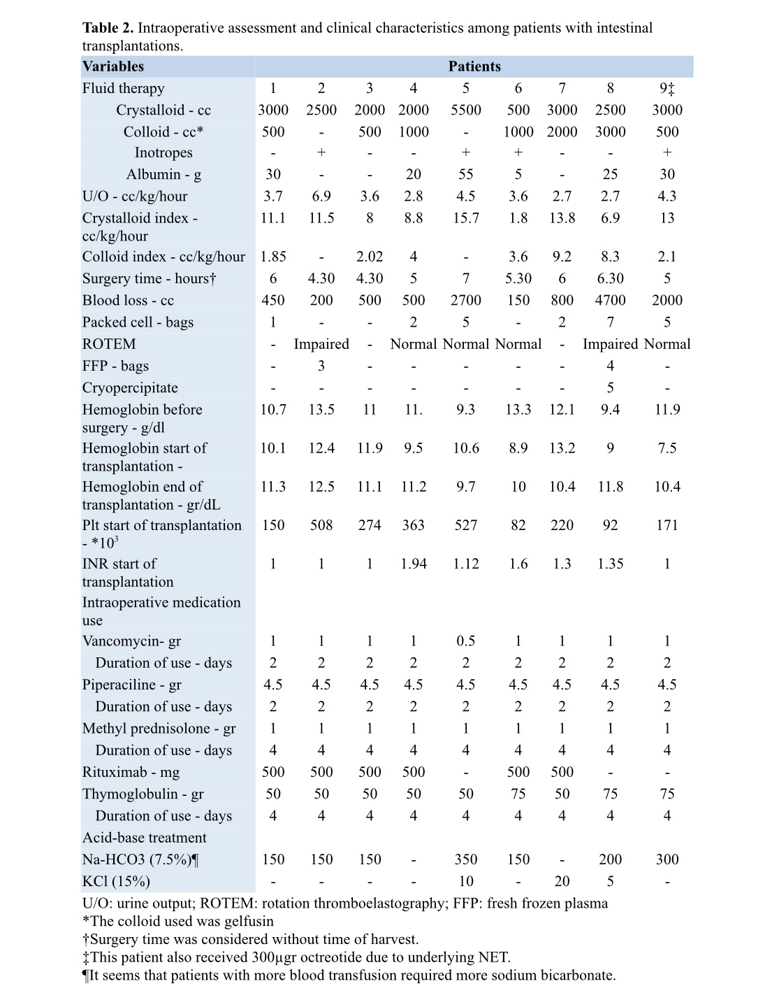 Results: Mean (SD) age of patients was 37.5 ± 12.5 years. Majority of patients were females (7/9). Median (IQR) waiting time for patients from diagnosis to transplantation 79 (34, 164) days. Our seven day survey of the amount of fluid therapy after transplantation, revealed that the greatest need for fluid therapy was seen on the second postoperative day. After transplantation two patients showed a total of three episodes of severe rejection, one of which was antibody mediated. The one-year survival was 66.6% and the two year survival was 44.5% in our study population. The median (IQR) time to death was 157 (26.5, 382) days. Most common cause of death was sepsis in our series (3/5).
