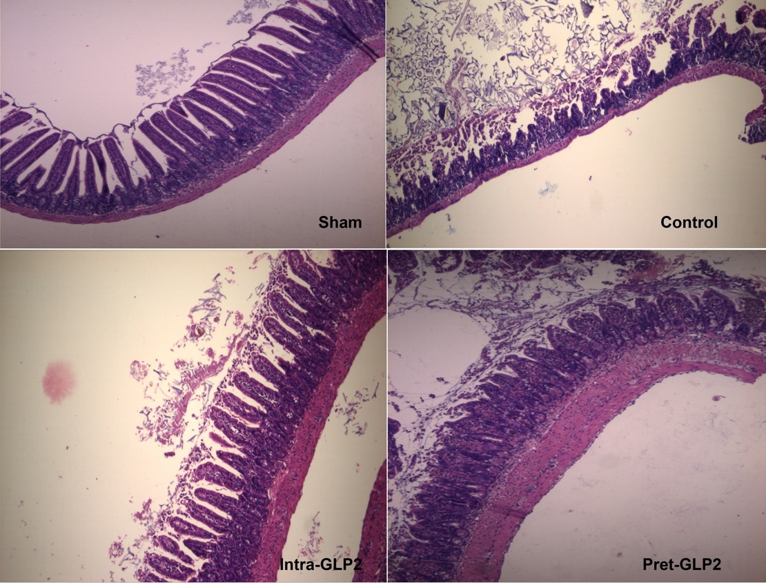 Conclusion: A marked decrease in IIR damage of intestine was observed by using GLP2 as pretreatment or intraoperative intraperitoneal. These preliminary results proof the hypotheses; the use of GLP2, to reduce IIR, opens a new line of research and potential new clinical use.