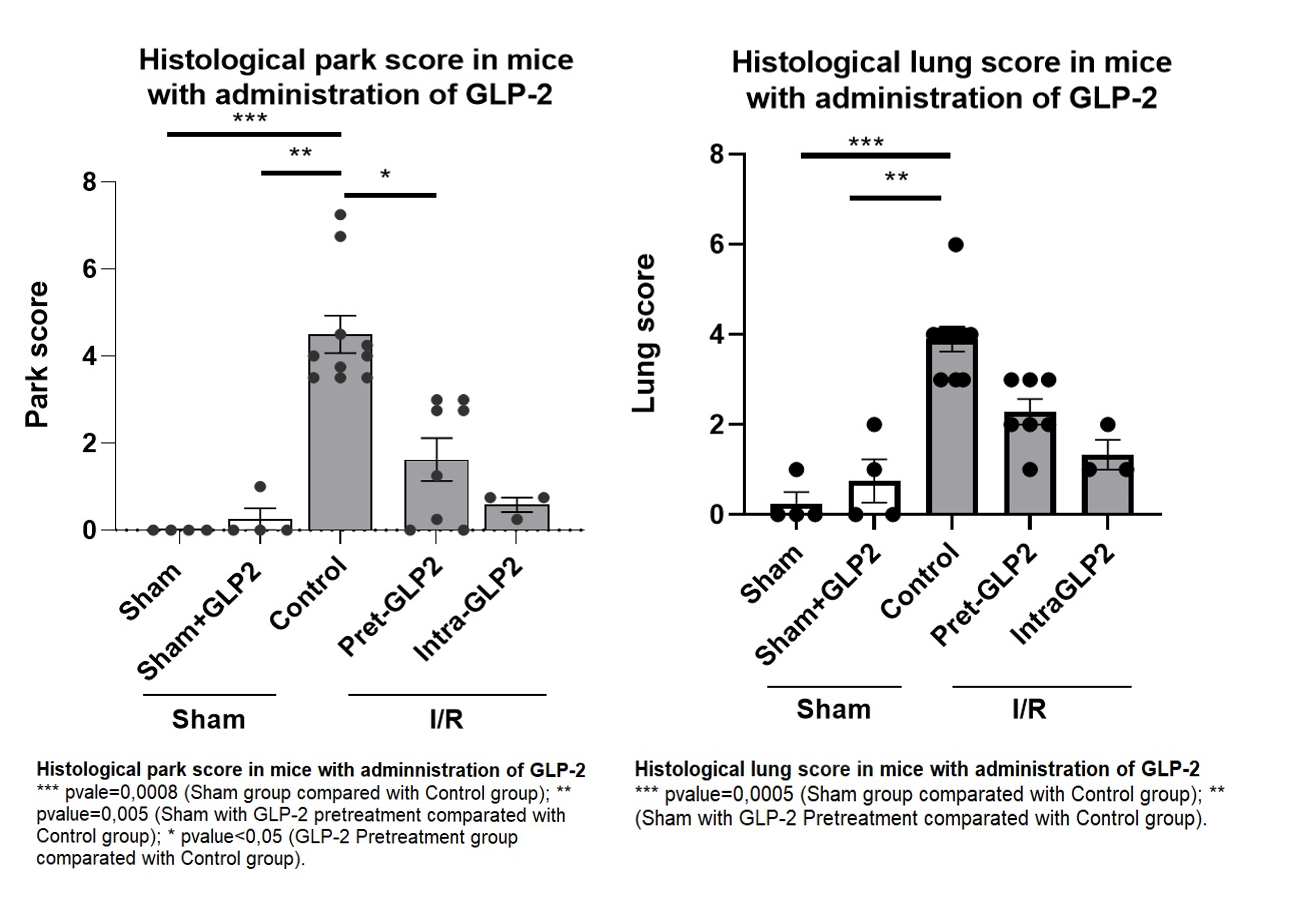 Methods: The study was approved by the internal review board and ethics committee for the care and use of laboratory animals (CICUAL UF 2019-004, #PICT 2016-3677). An IIR model clamping the superior mesenteric artery for 40 minutes followed by 30 minutes of reperfusion was proposed as control group. Five experimental lines has been be performed: 1) Sham Group, 2) Sham Group with intraperitoneal GLP-2 pretreatment for 3 days before surgery and an intraoperative dose (Sham+GLP2), 3) IIR Control Group, 4) IIR Group with intraperitoneal GLP-2 pretreatment for 3 days before surgery and an intraoperative dose (Pret-GLP2) and 5) IIR Group with only one intraoperative dose of GLP-2 (Intra-GLP2). After the reperfusion period, the mice were sacrificed and serum, intestine, liver and lung samples were taken. Histopathology and quantification of intestinal and pulmonary damage were performed. Park score was used for intestinal histological analysis. One-way ANOVA, and Kruskal-Wallis test were used.