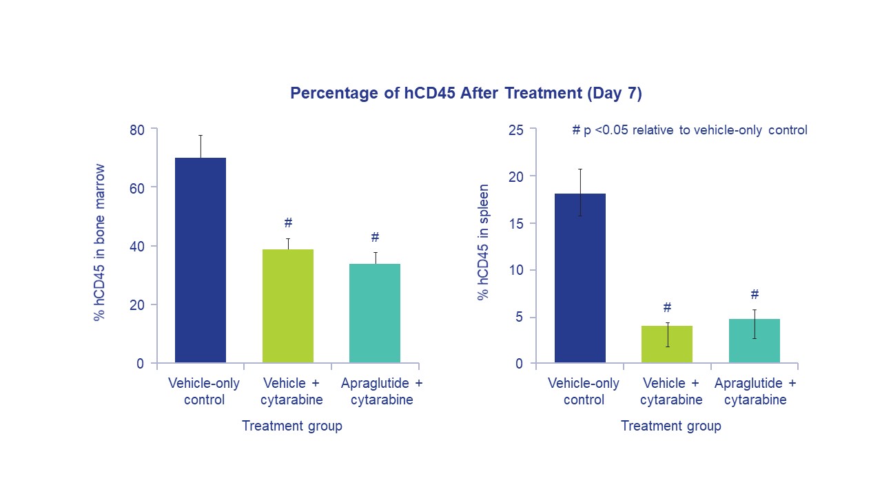 Methods: Study 1 assessed cytarabine’s antitumor effects in leukemic NOD/SCID mice. Apraglutide or vehicle was administered on Days -4 to 4. Cytarabine or vehicle was administered on Days 0-4. Bone marrow and spleen samples were collected on Day 7, and the percentage of hCD45+ cells was determined. Study 2 assessed the effect of apraglutide on cytarabine-induced immunosuppression and included three groups of Balb/c mice: (A) vehicle; (B) cytarabine on Days 5-9; (C) cytarabine on Days 5-9, concomitant apraglutide on Days 5-18. RBC, platelets, WBC, NEU, and LYMPH, were assessed. A cohort was allowed to survive for four weeks to evaluate the effect of apraglutide on immunosuppression recovery. Study 3 assessed the effect of apraglutide on melphalan-induced immunosuppression. Three groups of Balb/c mice were included: (A) vehicle; (B) melphalan on Day 9; (C) melphalan on Day 9, apraglutide pre-treatment on Days 1, 3, 5, 7 and continued as co-administration on Days 9, 11, and 13. WBC, NEU, and LYMPH were assessed.
