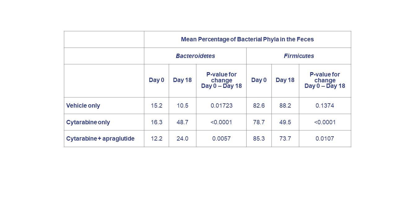 Results: Bacteroidetes and Firmicutes were the two leading bacterial phyla identified. Chemotherapy with cytarabine caused significant changes in the composition of bacterial species, increasing the Bacteroidetes population and decreasing the proportion of Firmicutes bacteria. The change in Bacteroidetes and Firmicutes bacteria levels from Days 0 to 18 was significantly greater in the cytarabine-only and cytarabine + apraglutide mice vs. vehicle. However, this effect was reduced by apraglutide co-administration. The difference in the change between cytarabine-only and cytarabine + apraglutide groups reached statistical significance for both Bacteroidetes (0.2486; p<0.0001) and Firmicutes (0.2037; p<0.0001). In addition, the ratio of Bacteroidetes to Firmicutes bacteria present remained more constant in cytarabine + apraglutide than in the cytarabine-only group.