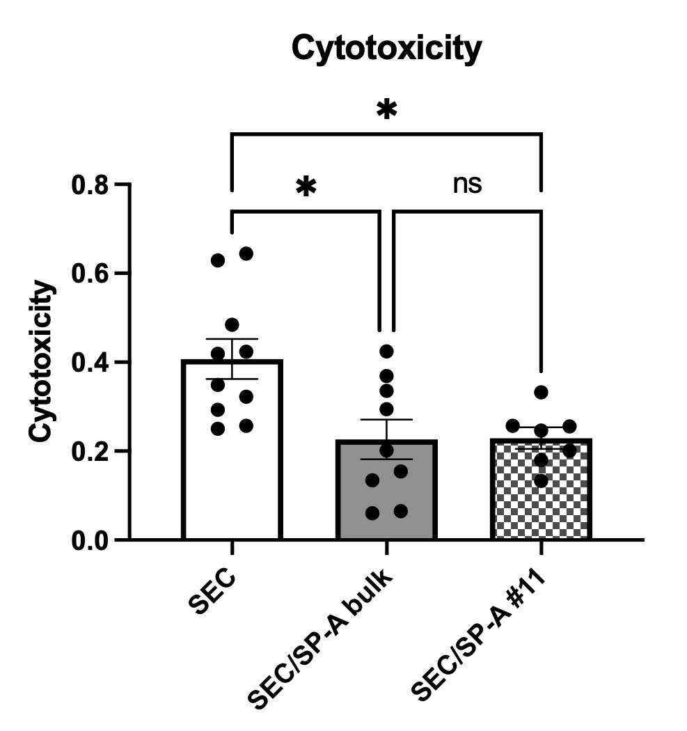 Methods: Naïve SEC and SP-A-transfected SEC (SEC/SP-A) were co-cultured with THP-1 cells and cytotoxicity was evaluated. To investigate the effect on phagocytosis, human macrophages were co-cultured with SEC or SEC/SP-A, and the extent of phagocytosis and production of reactive oxygen species (ROS) were assessed by flow cytometry. The mRNA expression of inflammatory cytokines in macrophages was determined using RT-PCR. In addition, THP-1 cell with a luciferase reporter gene driven by an NF-kB response element (THP-1 Luc NF-kB) cells was used to verify their effects on the NF-κB transcription factors.