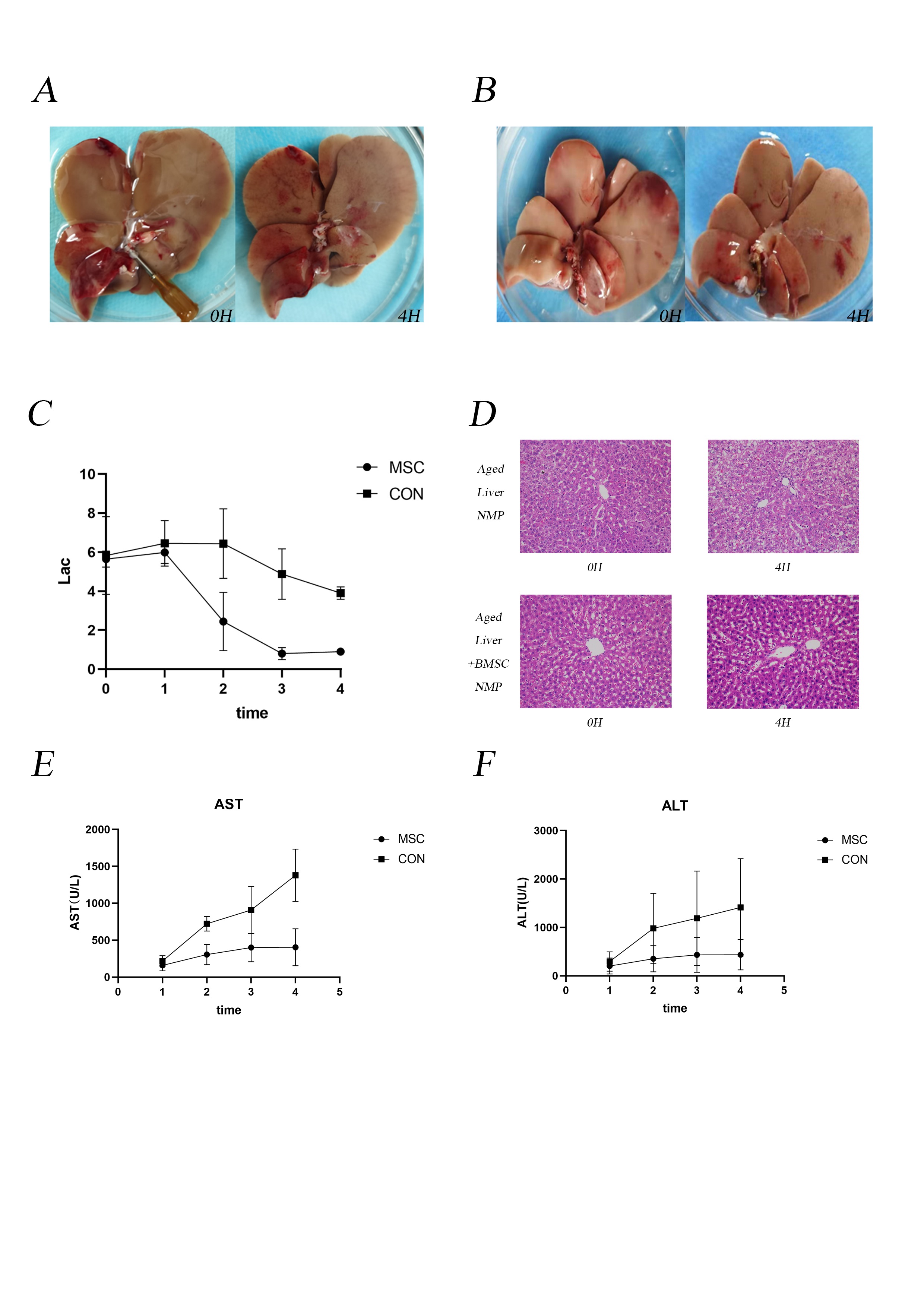 Methods: The SD rats used for NMP were all over 14 months of age. BMSCs were isolated from the bone marrow of SD rats. Rats were anesthetized and cardiac arrest was induced by compression of the heart for 30 minutes as warm ischemia prior to donor liver harvesting. The liver was connected to a rat liver perfusion machine for NMP with or without 10^6 BMSCs infusion.