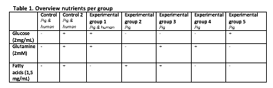 Methods: Pig kidneys were procured at a local slaughterhouse. After 30 minutes of warm ischemia kidneys were perfused with oxygenated hypothermic machine perfusion for 3 hours. For the human kidney, a cortical peace was cut off and put on cold storage until arrival at the lab. Thereafter, precision-cut kidney slices (PCKS) were made and incubated for 24 or 48 hours in different incubation media. The basic incubation medium was Dulbecco's Modified Eagle Medium (DMEM) without glucose and pyruvate supplemented with ciprofloxacine (10 µg/mL) and fungizone (0,25 µg/mL). To the groups either glucose, glutamine and/or fatty acids were added (table 1). At zero, 24 and 48 hours, mitochondrial respiration, using the Oxygraph-2k, was assessed, in which the glycolysis (pyruvate and glutamate) and the beta-oxidation of fatty acids (C16-carnitine) were stimulated. Furthermore, mitochondrial energy status and injury markers in the incubation medium were analyzed.