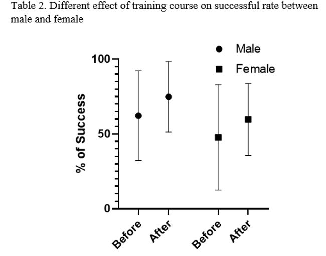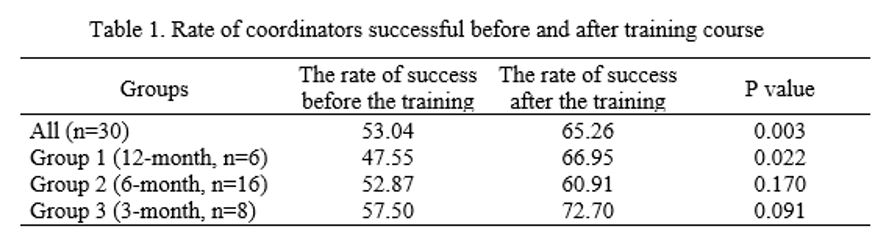 Results: Thirty volunteers participated in three separate groups in training courses. From them, 11 participants were male. The median confrontation with the family of patient with brain death was 5.5 times (min:2 and max:35) before the training course and 8 times (min:2 and max:40) after the training course. Overall, the training course improved the rate of coordinators’ success (increasing the rate of success from 53.04 to 65.26%, p value=0.003) (table 1). Sub-analysis on groups showed that this improvement is more significant in long periods and the percent of success increased 19.39% in group 1, 8.03% in group 2, and 15.20% in group 3. Furthermore, sub-analysis on coordinators’ gender showed that female coordinators’ improvement was significant during training course (p value =0.02) but this increase was not significant in males (P value=0.06, Table2).