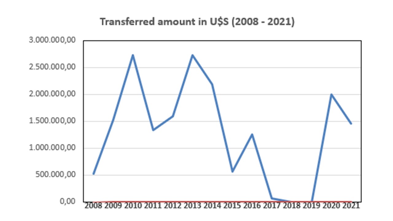 The largest number of projects coincides with the start-up and activity of the USP, which has generated investment guides for projects and has provided technical assistance to facilitate and promote the presentation of projects. The largest amount transferred in US dollars was to 2010 (2,731,665 in 5 projects), followed by 2013 (2,731,248 in 11 projects) and 2014 (2,179,979 in 6 projects).
