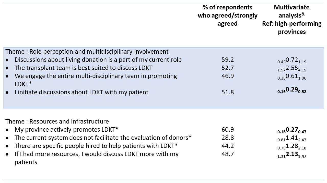 Results: We obtained 353 complete responses. Overall, themes related to poor communication, poor role perception and HPs education/training/comfort emerged as barriers to LDKT. When compared with HPs from high-performing provinces, those from low-performing provinces had lower odds of agreeing that their province promoted LDKT (aOR=0.27, 95%CI:0.16-0.48). They also had lower odds of initiating discussions about LDKT (aOR=0.30, 95%CI:0.17-0.55), higher odds of agreeing that the transplant team is best suited to discuss LDKT (aOR=2.64, 95%CI:1.60-4.33) and that more resources would increase LDKT discussions from them (aOR=2.06, 95%CI:1.25-3.40). When comparing responses by HP characteristics, non-physician role and <10 years of experience were associated with the level of agreement across several themes. Creating guidelines, streamlining evaluations, and improving communication were ranked as priorities to increase LDKT over patient education.