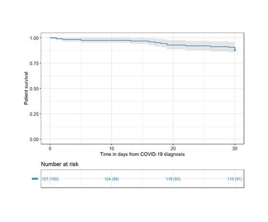 Results: During the study period, we found 191 cases of COVID-19 in our kidney transplant recipients. We excluded 64 patients (33.5%) because patient data was not available for follow-up. Most of the patients were men (n = 72, 56.7%) with a mean age of 48.3 years. Only 14.2% of the patients were vaccinated at the time of diagnosis for COVID-19. The most frequently used immunosuppressive regimen was tacrolimus/mycophenolate in 98 patients (77.2%). The most common symptoms were respiratory symptoms (73.2%) and fever (53.5%), and 38 patients (29.9%) developed acute kidney injury. A total of 55 patients required hospital admission, among those, 18 (32.7%) were admitted in ICU. A total of 7 patients (5.5%) lost kidney grafts. The probability of graft survival was 94.1% (IC 95%: 0.90-0.98) at 30 days of follow-up. A total of 15 (11.8%) patients died during the study period and the probability of patient survival was 88.2% (IC 95%: 0.82-0.94) at 30 days of follow-up. We found that patients with a severe disease admitted to ICU had a significant higher mortality rate compared to those admitted in general hospitalization.