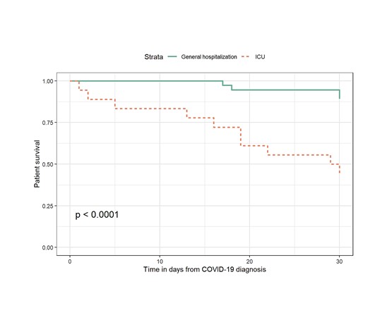 Materials and methods: An observational analytic study by retrospective cohort was performed. We included adult kidney transplant patients with COVID-19 in Colombiana de Trasplantes from June 1st to July 31st of 2021. We performed a descriptive analysis with demographic and clinical characteristics. Patient and graft death-censored survival probabilities were calculated using the Kaplan-Meier method. Survival curves were compared for the patients admitted in general hospitalization and ICU.