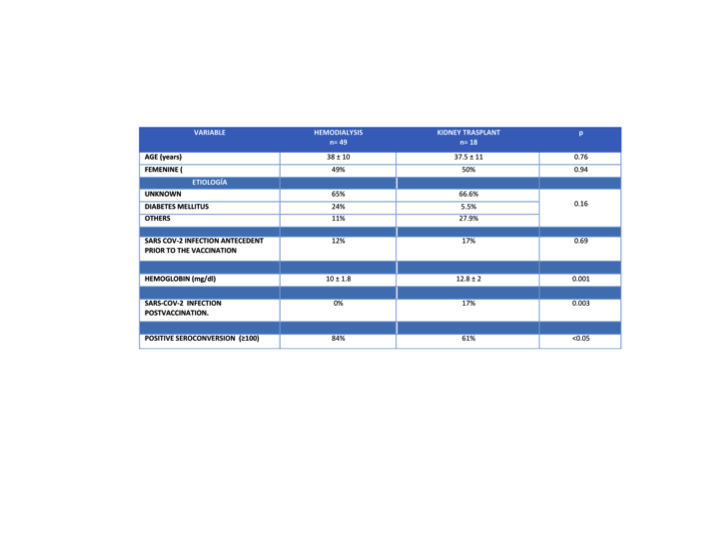 Results: 67 patients were included, 49 in HD and 18 with KTR. In the multiple logistic regression analysis, taking the positive seroconversion ≥100 U/mL as the dependent variable, the KT was the risk factor associated with a lower seroconversion frequency, p<0.05 Exp(B) 3.26.