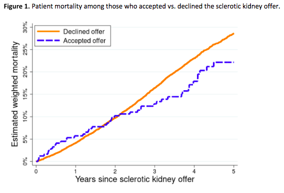 Introduction: Waitlist candidates who accept the offer of a sclerotic kidney are faced with increased risk of delayed graft function and graft loss, but candidates who decline must wait for a future offer that could involve additional risks or may never materialize. To investigate the potential benefits of accepting a sclerotic kidney, we compared patient mortality between recipients of sclerotic kidneys and waitlist candidates who declined offers of the same kidneys.
