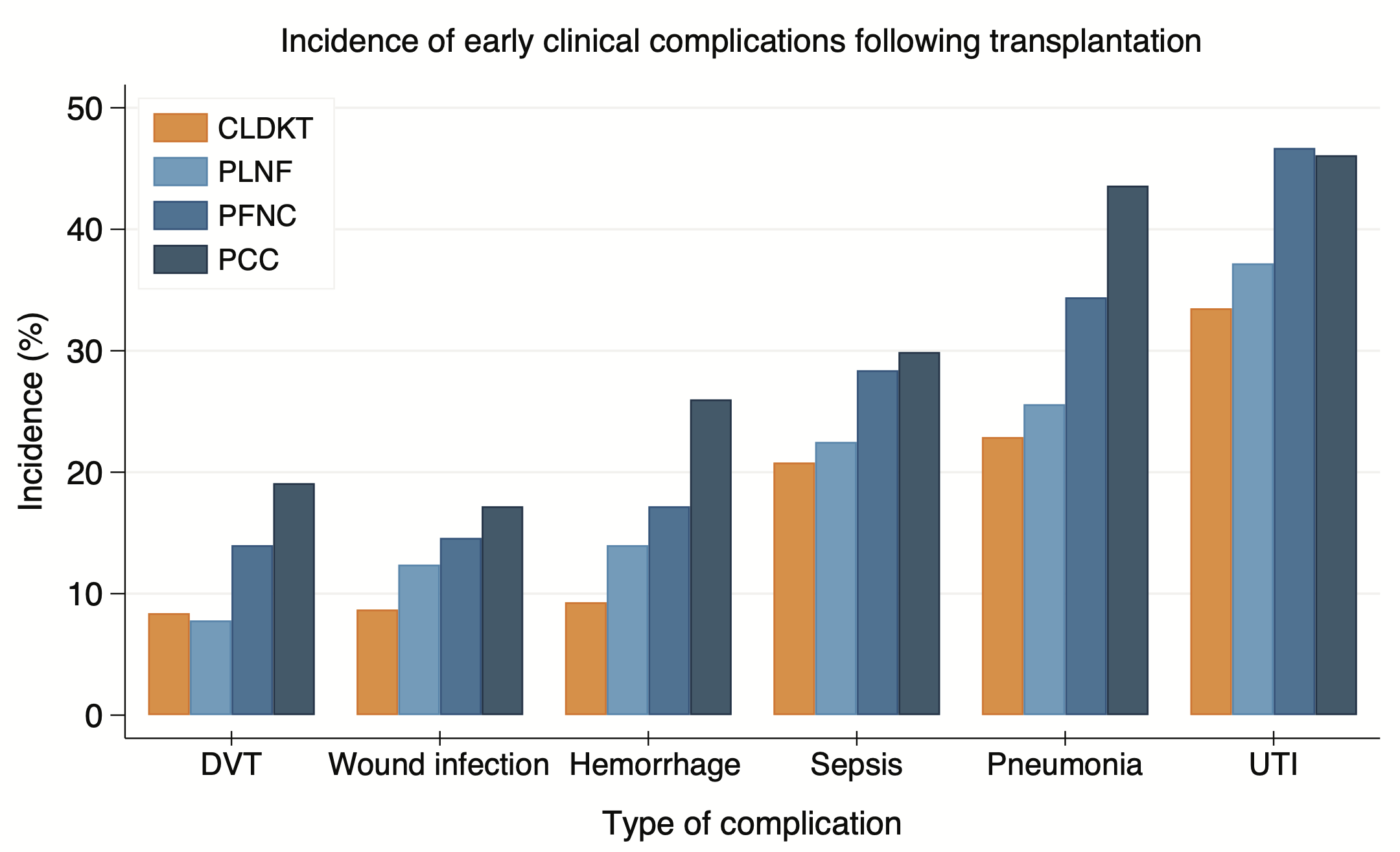 Results: Compared to CLDKT recipients, ILDKT recipients had higher incidence of DVT (14.4% vs. 8.4%), wound infection (15.0% vs. 8.7%), hemorrhage (19.2% vs. 9.3%), sepsis (27.7% vs 20.8%), pneumonia (35.5% vs. 22.9%), and UTI (44.7% vs. 33.5%) (p for all comparisons<0.001) (Figure). Within the first three months, a higher risk of DVT (wHR PLNF=0.050.453.93; PFNC=0.941.793.39; PCC=1.001.883.52), wound infection (wHR PLNF=0.691.232.19; PFNC=1.241.602.06; PCC=0.801.693.62), and hemorrhage (PLNF=1.111.963.47; PFNC=0.911.823.65; PCC=2.072.964.21) were observed across varying levels of DSA strength; however, the risk of these complications decreased thereafter. Although there was no evidence of increased risk of sepsis with the first three months, this risk subsequently increased (PLNF=0.811.874.28; PFNC=0.991.502.30; PCC=1.102.314.81). In contrast, there was higher risk of pneumonia that persisted throughout both time periods (0-3 months wHR PLNF=0.851.914.29; PFNC=1.142.073.75; PCC=1.342.735.59; >3 months wHR PLNF=1.241.571.99; PFNC=0.811.422.49; PCC=1.051.913.48).