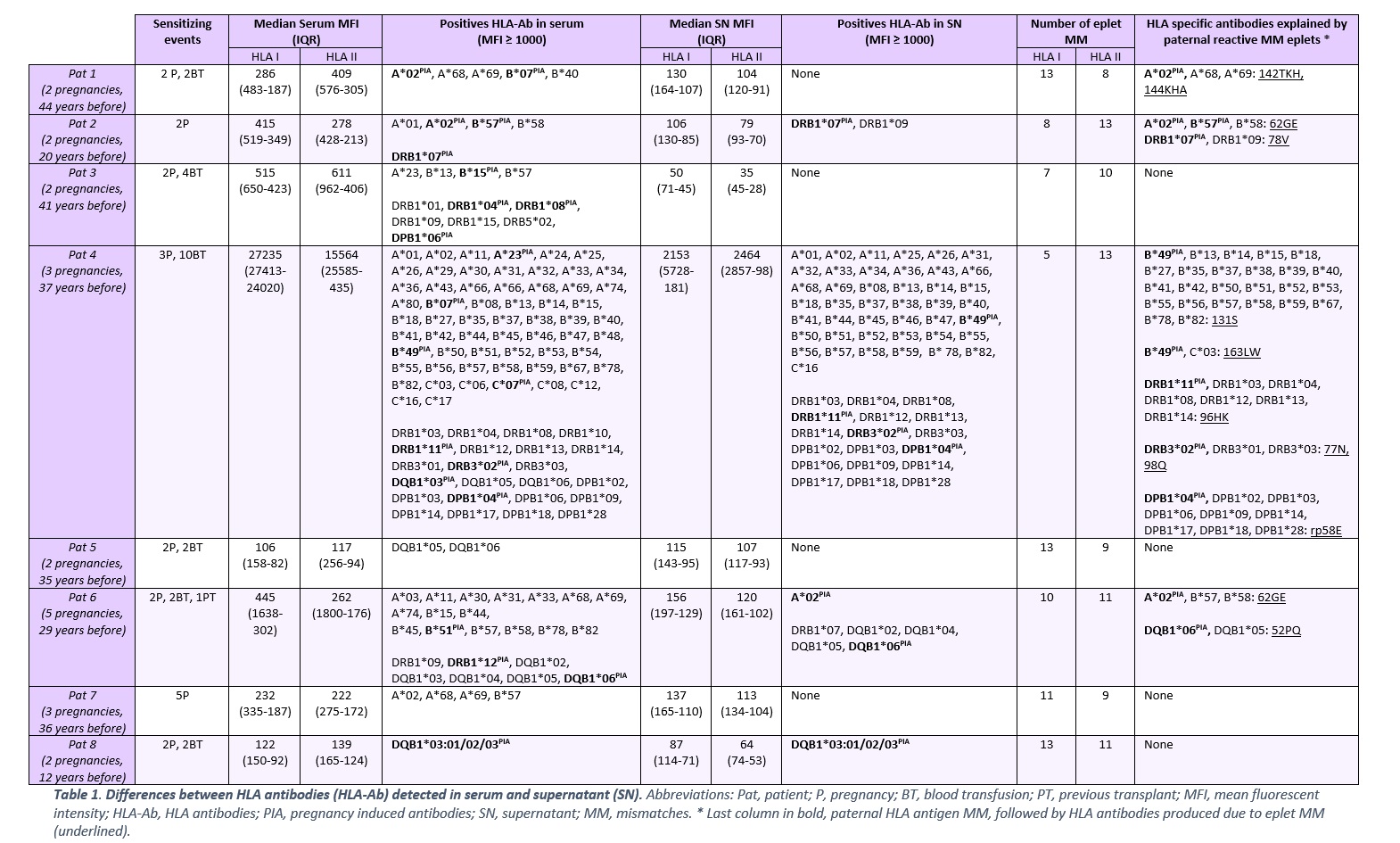 Methods: We selected 8 HLA sensitised women awaiting KT with at least one successful pregnancy from a single partner, detectable serum HLA-Ab (MFI≥1000) and available paternal DNA for full HLA typing. All women and their partners were typed by next-generation sequencing for HLA–A, B, C, DRB1, DRB3/4/5, DQB1/A1, DPB1. To study mBc, we used peripheral blood mononuclear cells cryopreserved before KT and cultured them with a polyclonal stimulation cocktail consisting of a toll-like receptor agonist and an interleukin for ten days. We examined concentrated culture supernatants (SN) derived from activated mBc, purified IgG and identified HLA-Abs using single antigen beads on Luminex®. Then, we compared the HLA-Ab profiles of SN and serum. We also studied the paternal molecular HLA mismatch with HLAMatchmaker® software.