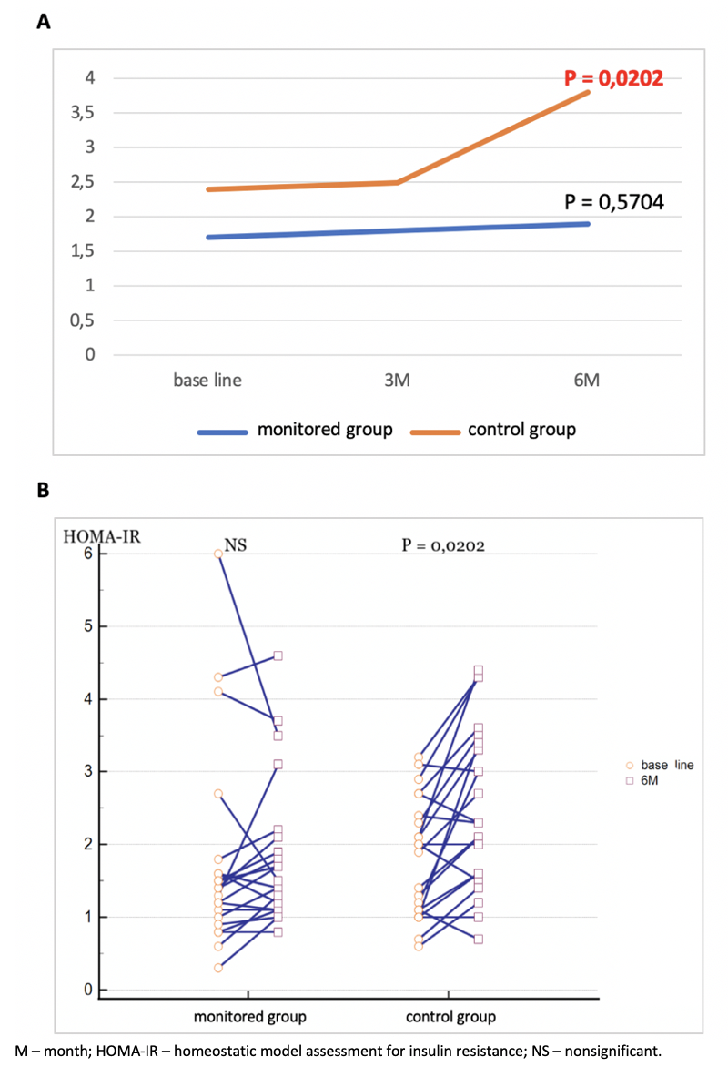Methods: This was a prospective controlled analysis, which included 44 patients after primary KT in the Martin Transplant Center. Half consisted of a study group (n = 22) whose patients were assigned to perform regular physical activity. The primary goal was to complete at least 150 minutes of moderate intensity physical exertion per week. They performed an aerobic or combined (aerobic + strength) type of sports activity. Monitoring was provided by a sports tracker (Xiaomi Mi Band 4 compatible with Mi Fit mobile application). The other half was made up of a control group. The exclusion criterion at that time was already diagnosed with diabetes mellitus or a pre-diabetic condition. IR was assessed using the HOMA-IR (Homeostatic Model Assessment for Insulin Resistance) index from fasting blood glucose and insulinemia values. Each patient underwent an oral glucose tolerance test (oGTT) at the end of follow-up. Patients in both groups have the same immunosuppressive protocol. The duration of follow-up was 6 months.